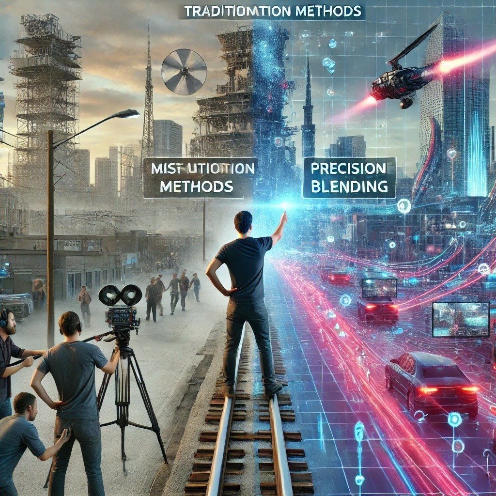 A post-production team faces challenges in blending CGI elements with real-world footage, especially when dealing with complex cityscapes and futuristic settings.