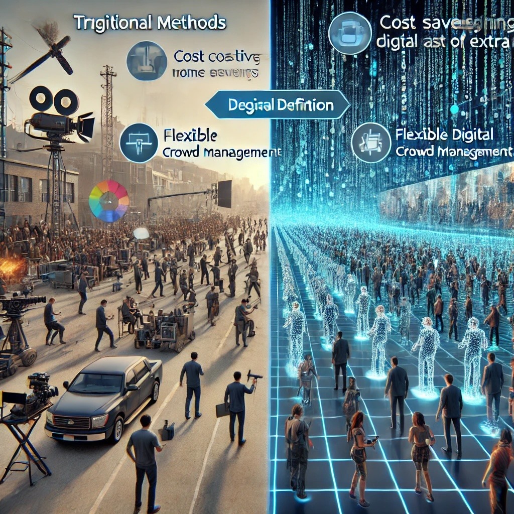 A film requires a large cast of extras for background scenes, but hiring and coordinating hundreds of extras is time-consuming and expensive.